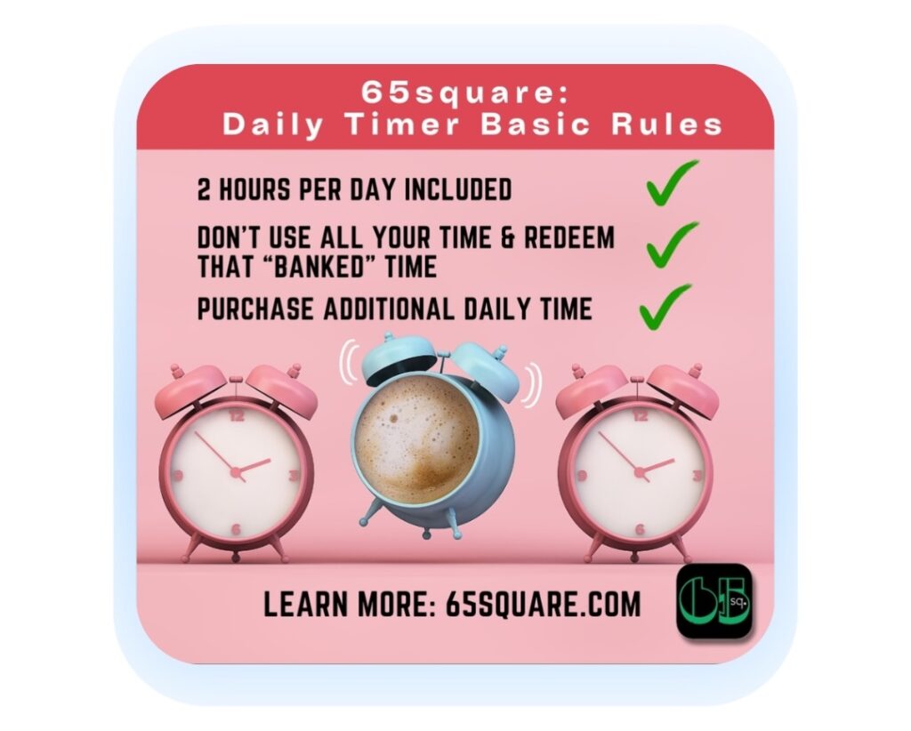 This is why we’re placing a 2-hour daily timer on all users’ experience inside 65square. Not only for your wellness, but for the health of the environment. If someone is addicted to social media, it can significantly impede their life. With 2-hours a day, we hope that you can start to think differently about how you consume social media and energy. If two hours a day isn’t enough, you can pay for it, or even bank free time from unused time throughout the week. The timer won’t run while you aren’t on the app, so you’re truly only paying for what you use. It’s fair, equitable and makes sure we can keep costs as low as possible for you. When you’re being kicked off 65square after your daily timer expires, you will be prompted with a recommendation to get off your phone and to enjoy your life in the real world. Imagine if Instagram told you to do that?!